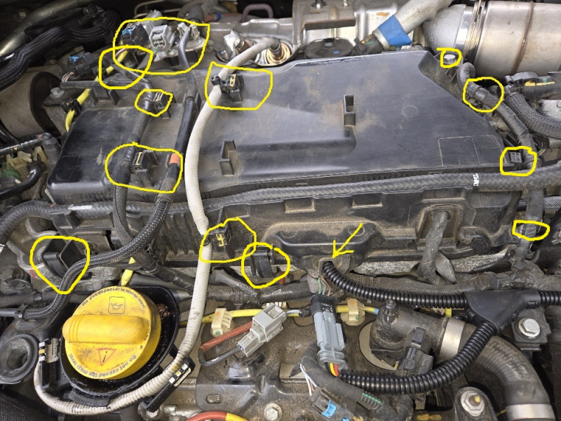 j'ai joint 2 photos avec sur une la flèche indiquant le cache qu'il faut enlever afin d'avoir accès à la connectique du common rail, Sur la photo 2 les câbles à déclipser ainsi que trois vis et deux clips.