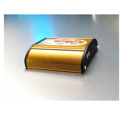 - Le boîtier est entièrement en aluminium anodisé de couleur or et noire, ce qui lui confère une grande résistance mécanique et une parfaite conductivité thermique, ainsi qu'un look très élégant. Ses dimensions sont de 8cm par 7cm et une épaisseur de 2,5cm.